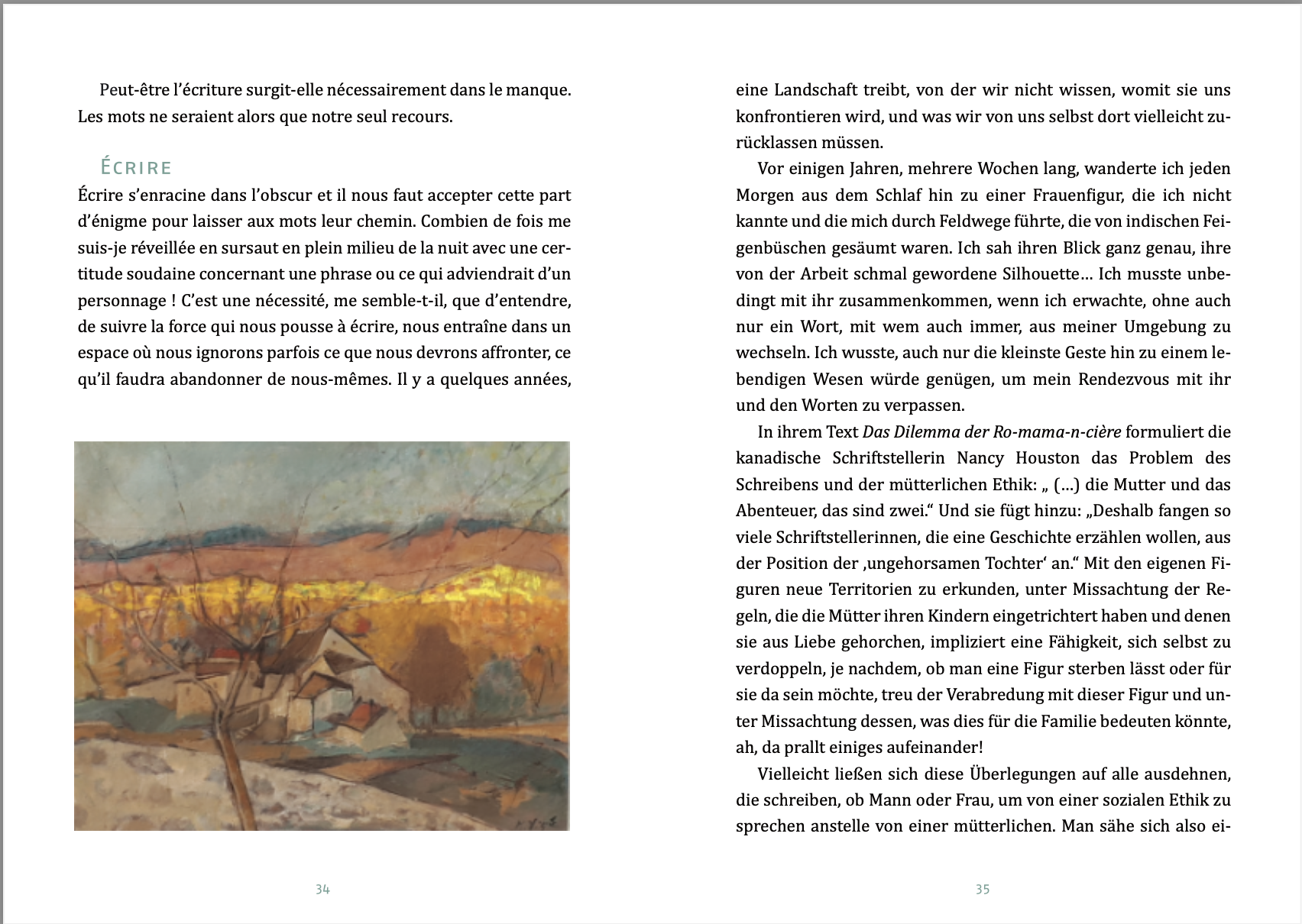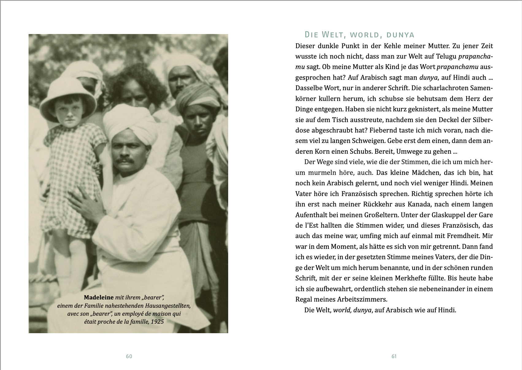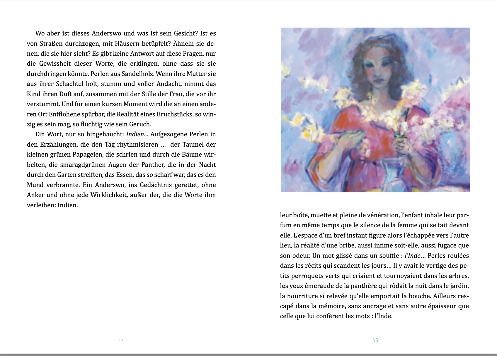 Die Vielsprachigkeit ihrer Familie, die Sehnsucht ihrer Mutter nach dem Indien ihrer Kindheit, das Geheimnis ihrer Malerei? In zwei erzählerischen Essays verortet sich die Schriftstellerin. Le multilinguisme de sa famille, la nostalgie de sa mère pour l’Inde de son enfance, le secret de sa peinture ? Dans deux essais narratifs, l’écrivaine s’invente son lieu.